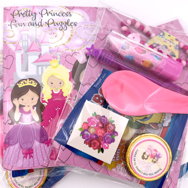 Each princess party parcel contents pack comes in a plain cello sleeve, ready to pop into the party bag of your choice